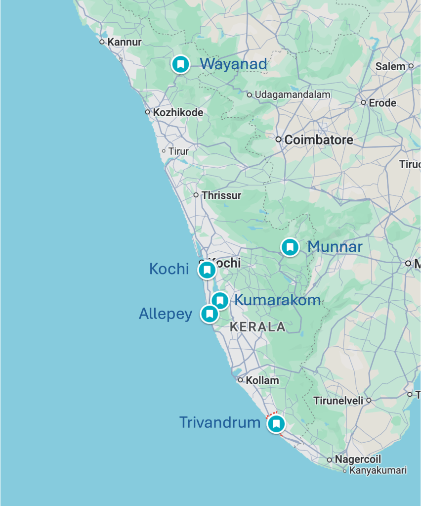 A picturesque hill station renowned for its tea plantations, rolling hills, and cool climate. Visit the Tea Museum, Eravikulam National Park, and enjoy trekking opportunities.